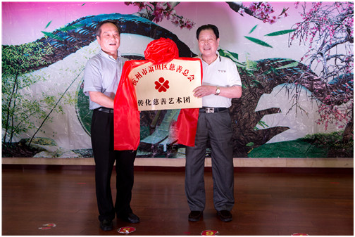 81歲高齡的徐傳化老先生,在1995年親手創(chuàng)辦傳化藝術(shù)團。今天,他親手從蕭山區(qū)慈善總會會長汪柏遂手中接過“傳化慈善藝術(shù)團”牌匾。