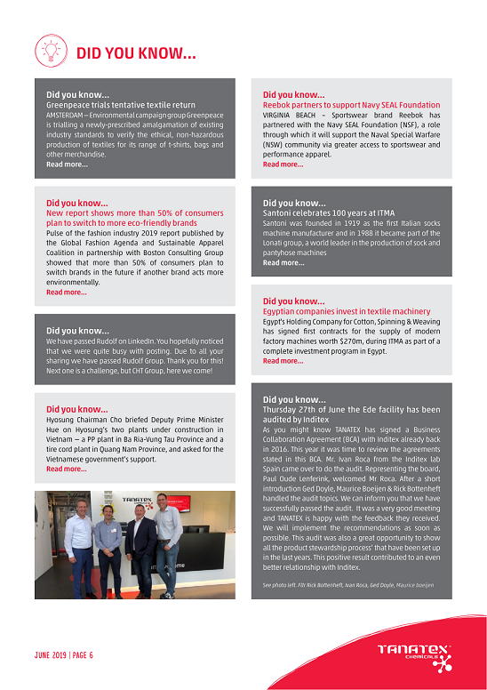 As you might know TANATEX has signed a Business Collaboration Agreement (BCA) with Inditex already back in 2016. This year it was time to review the agreements stated in this BCA. Mr. Ivan Roca from the Inditex lab Spain came over to do the audit. Representing the board, Paul Oude Lenferink, welcomed Mr Roca. After a short introduction Ged Doyle, Maurice Boeijen & Rick Bottenheft handled the audit topics. We can inform you that we have successfully passed the audit. It was a very good meeting and TANATEX is happy with the feedback they received. We will implement the recommendations as soon as possible. This audit was also a great opportunity to show all the product stewardship process’ that have been set up in the last years. This positive result contributed to an even better relationship with Inditex.