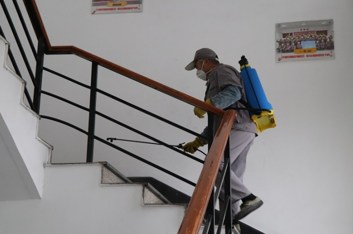 (正在對(duì)廠區(qū)區(qū)域消毒的李寶林)